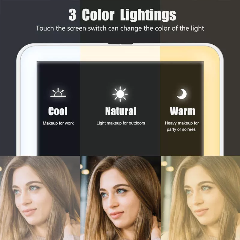 Ez az asztali LED sminktükör három állítható fénymóddal rendelkezik (hideg, természetes, meleg), hogy minden sminkforgatókönyvhöz megfeleljen. A hideg fény ideális a munkahelyi sminkekhez, a természetes fény a kültéri megjelenéshez és a meleg fény az esti eseményekhez. A puha, villogásmentes LED-gyűrű élethű színvisszaadást biztosít, így még homályos környezetben is precíz sminkfelvitelt biztosít.